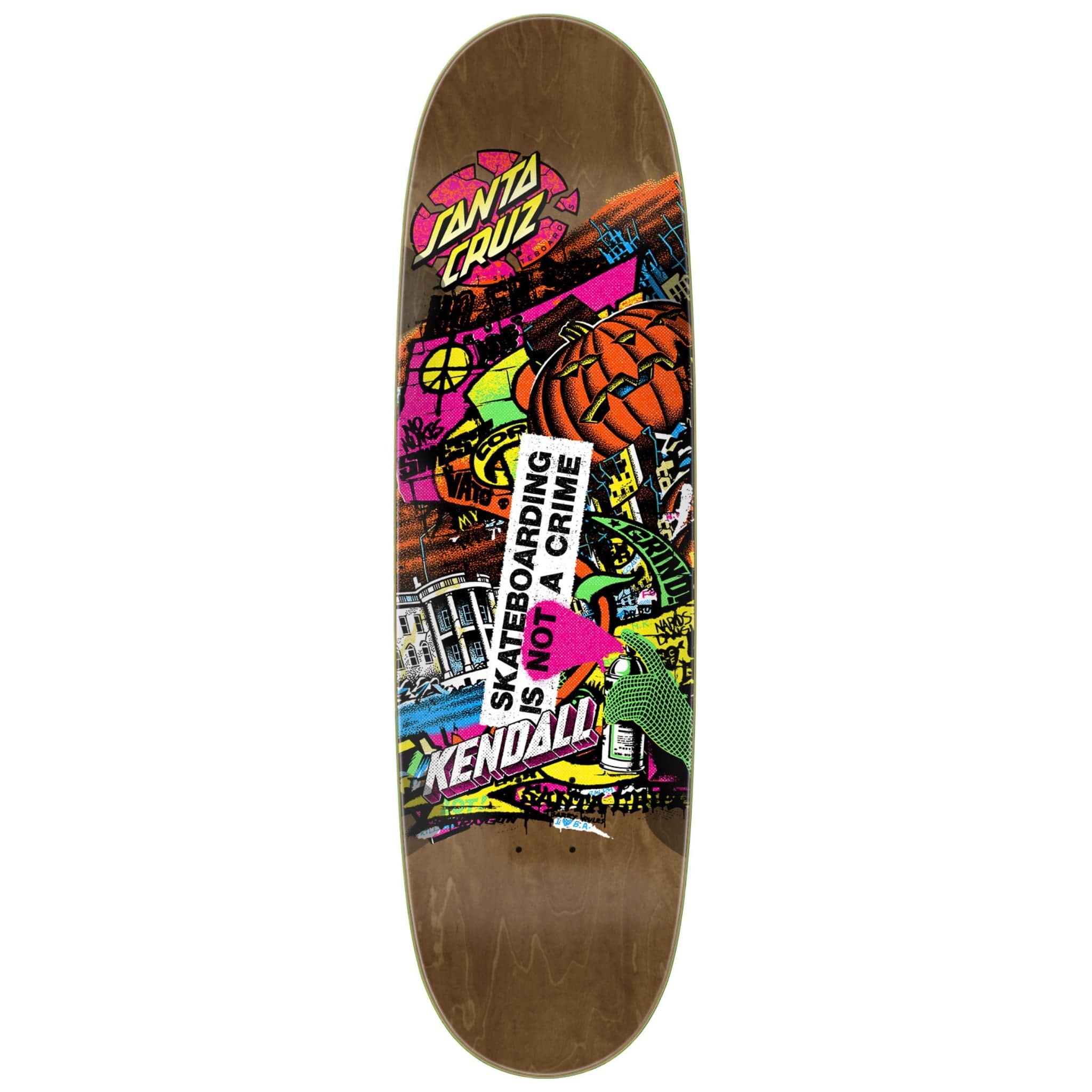 he Santa Cruz Skateboards Jeff Kendall Street Art Collage VX Deck showcases an explosive blend of classic style and modern performance. Featuring spot matte and neon graphics on a brown stained veneer, this 9" custom egg-shaped deck is built for responsive control and standout visual appeal. With 4 wheel wells for added clearance and VX construction for durability, this limited deck is made to shred or display.