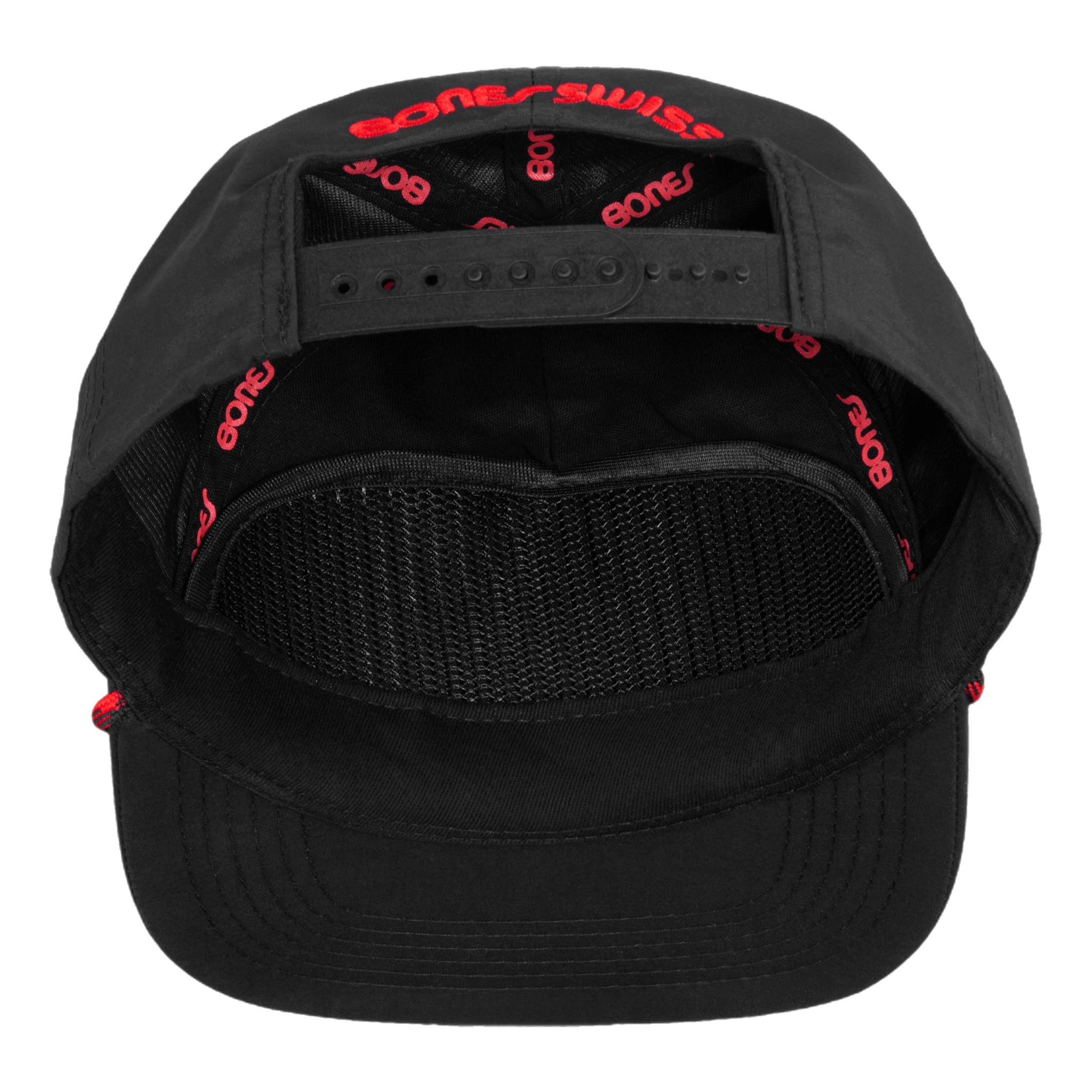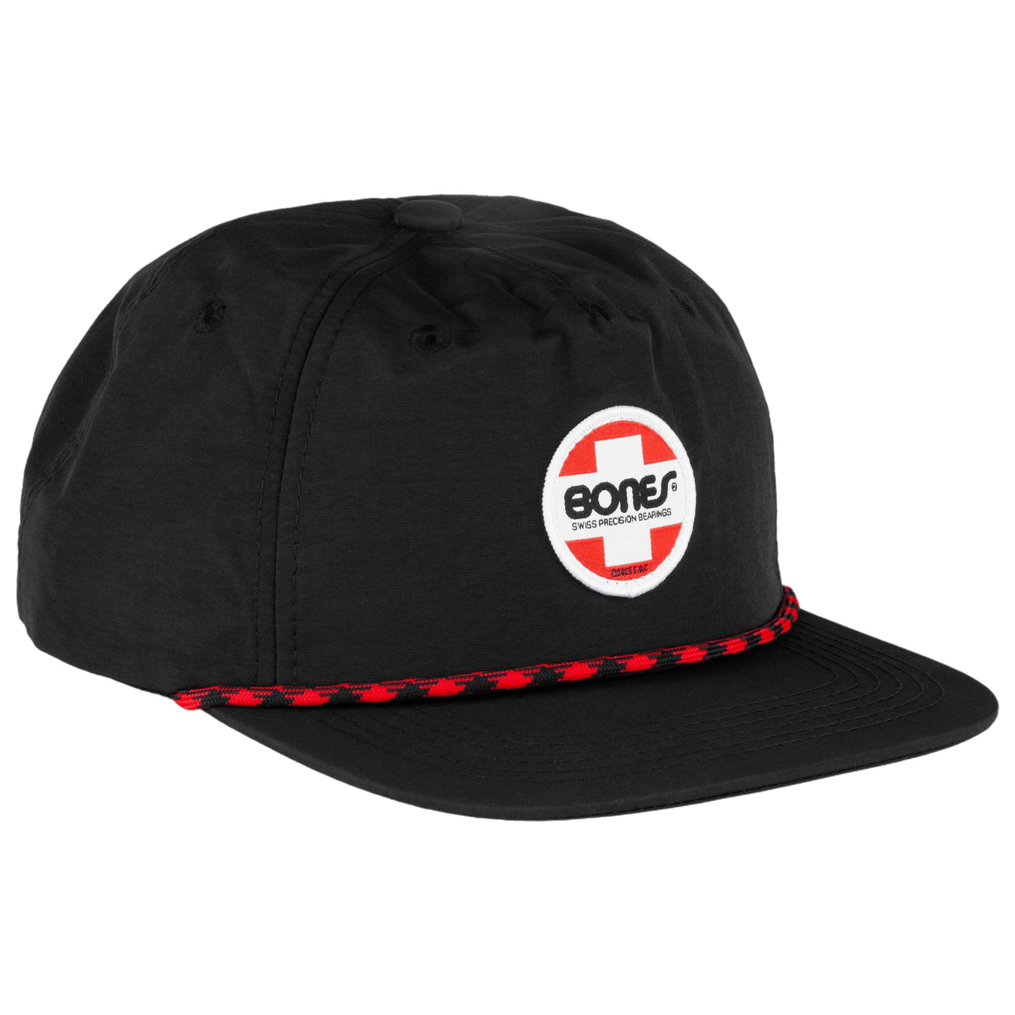 The Bones Bearings OG Swiss Circle Low Pro Cap is a classic nylon 5-panel hat with premium skate style details. Featuring a woven 1 3/4" OG patch on the front, embroidered Bones Swiss text arched over the back opening, and red Bones logo woven taping inside. Finished with a black and red rope embellishment across the visor and an adjustable closure for a perfect fit.