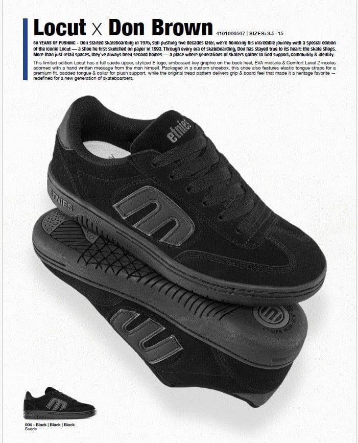 Don has pioneered the honoring of the skate shop for many years and has always stressed the importance through words and actions. So this skate shop day Etnies honored Don with his very own Locut. With limited branding insoles written by Don. This is a shoe that comes from a time when Don Was doing this work quietly!