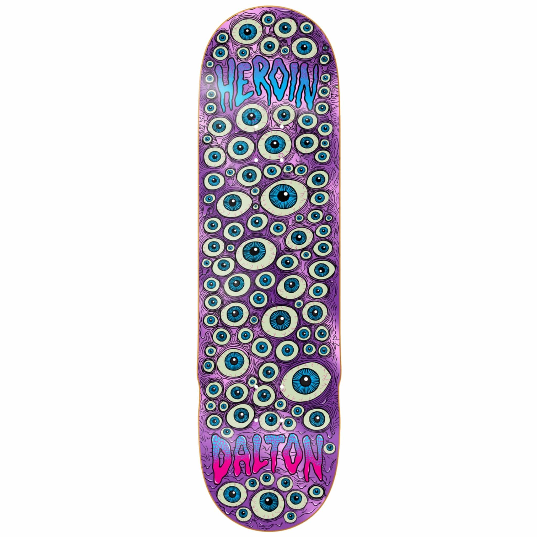 The HEROIN DALTON DERN EYES 8.625 features a distinctive foil purple bottom with money bump side accents, providing both aesthetic appeal and functional performance. This design enhances grip and control, essential for precision in various skating environments. The attention to detail ensures durability and style for the discerning skater.