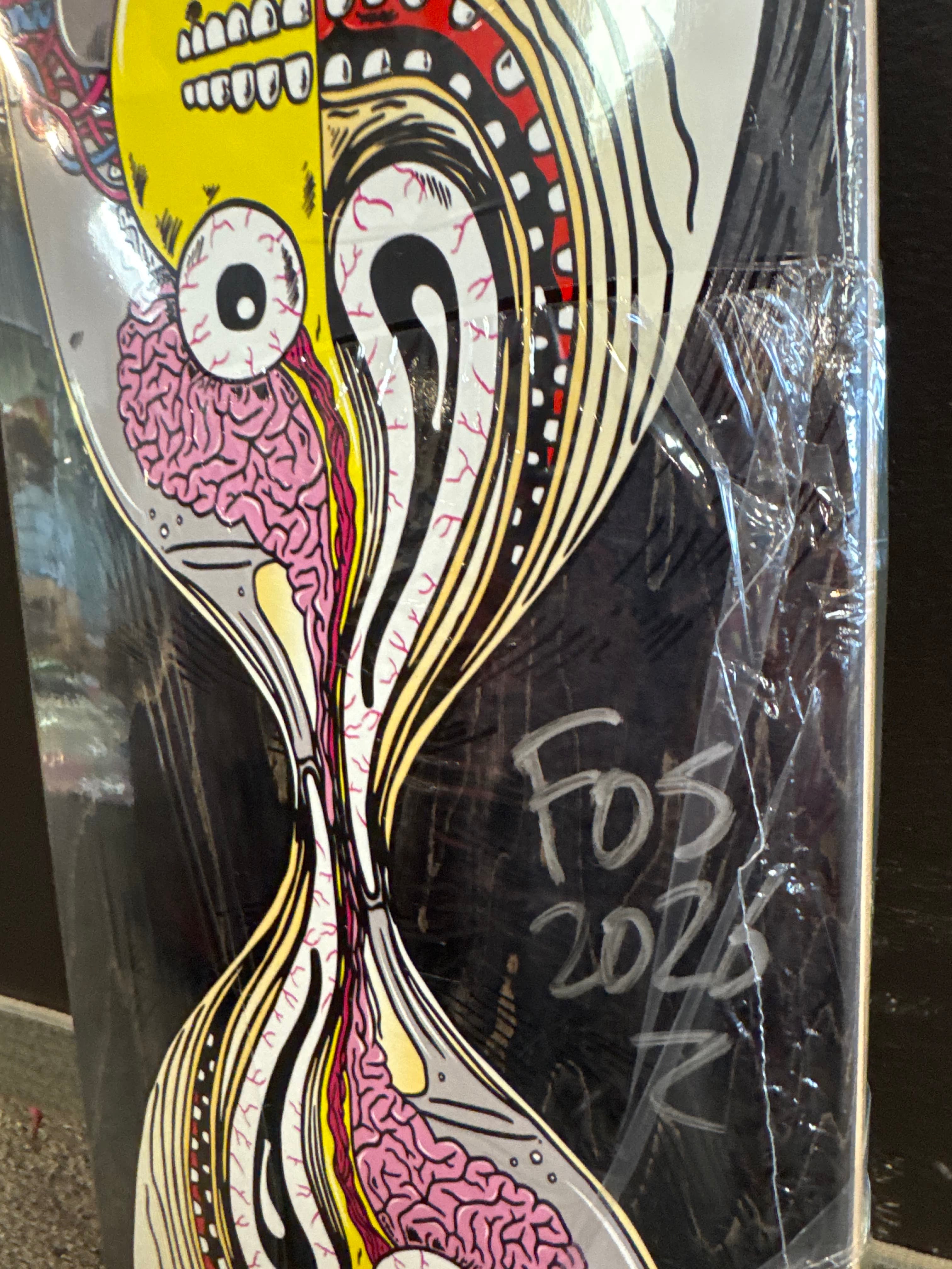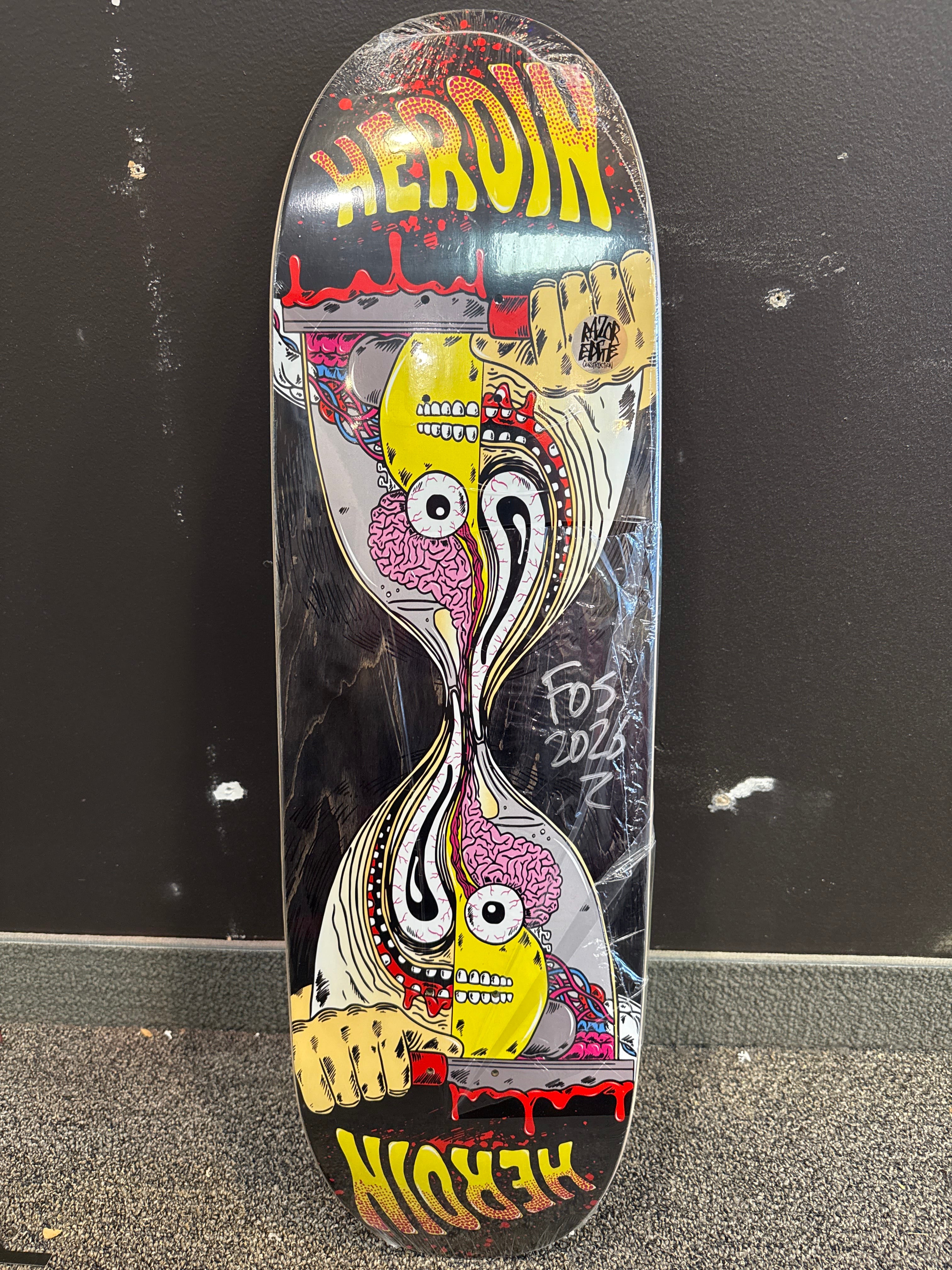 Heroin Skateboards Merged Anatomy deck, signed by artist Mark Foster, brings one of Fos’s raw, detailed graphics to life on a premium 7 ply maple construction. Featuring assorted stained veneers, each deck has a unique finish while delivering the solid shape and feel Heroin is known for. Built for collectors and skaters alike, this one stands out on the wall or under your feet.