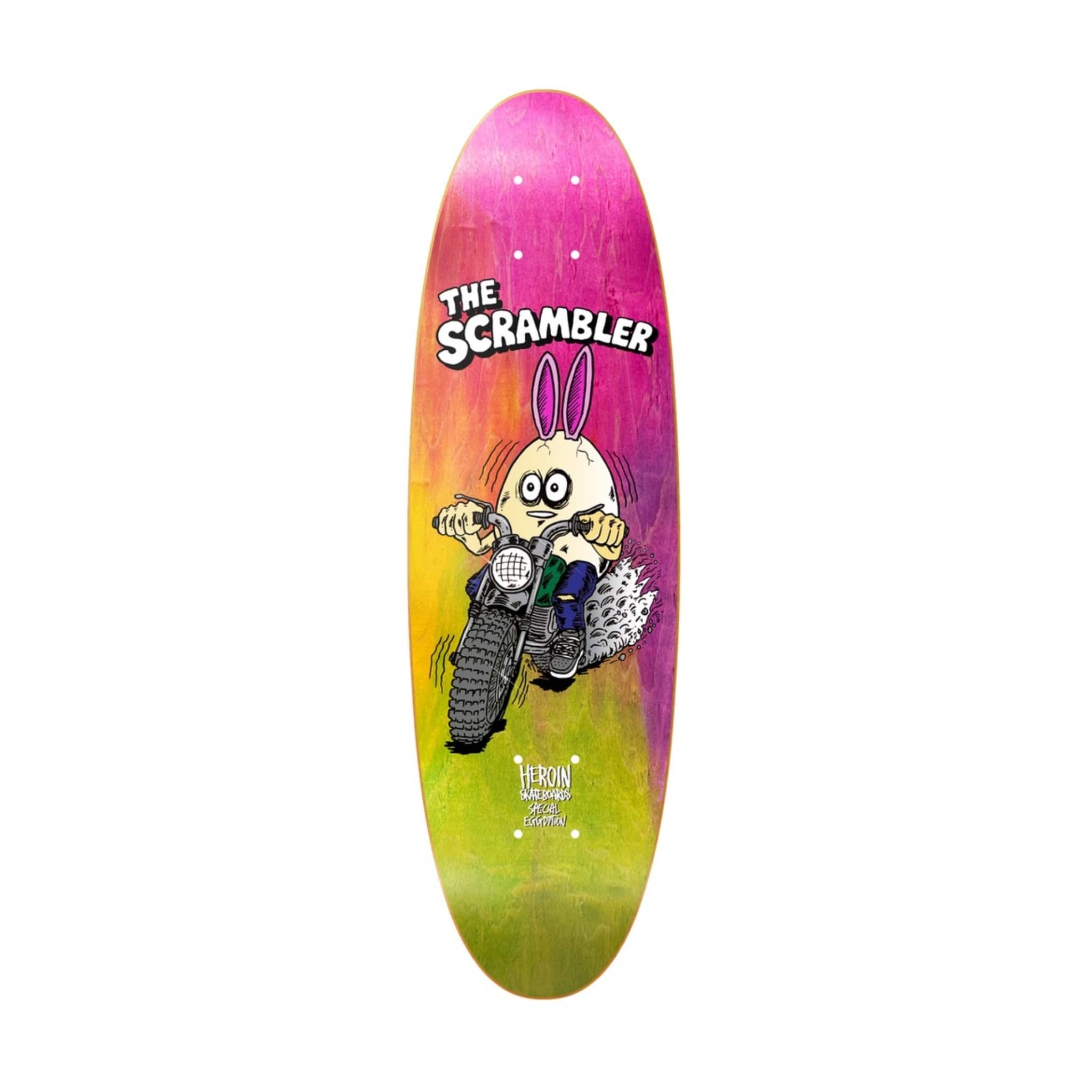 The Heroin Team The Scrambler Egg Shaped deck is a limited edition “small egg” setup built for quick control, tight turning, and straight-up fun. Measuring 7.875" x 26.5", this compact shaped deck is perfect for skaters who want a shorter, more responsive feel for curbs, mellow parks, driveway sessions, and creative street spots.