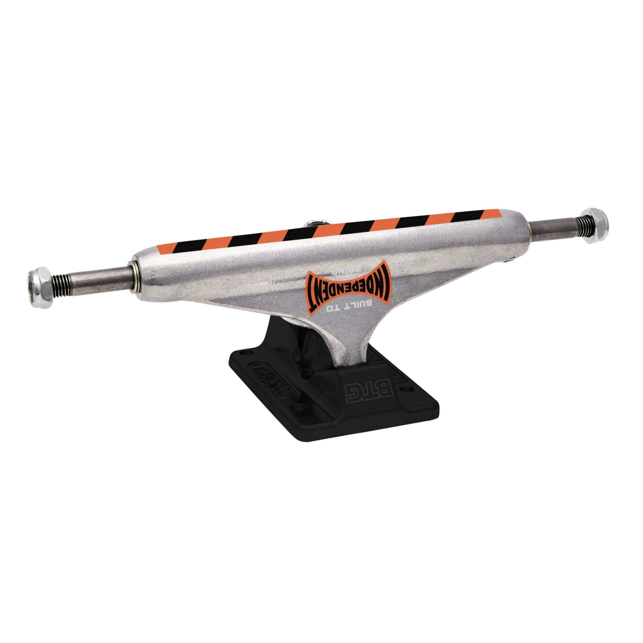 The Independent Stage 11 Built to Grind Trucks tie into Indy’s Built to Grind apparel collection with a DIY-inspired design. Featuring orange-and-black striped construction tape details, polished silver hanger with laser-etched and printed Span BTG logos, grind-off tape print, anodized black baseplate with BTG pivot housing stamp, laser-etched logo on the bottom, silver hardware, and orange cushions.