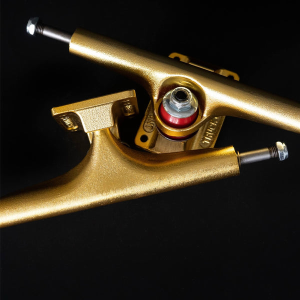 The Independent Truck Company Stage 4 Gold Trucks revive the iconic 1986 single wing hanger design, now upgraded with modern materials and precision manufacturing. Featuring a gold-tone hanger and baseplate, red 90a Original Cushions, and silver hardware, these trucks combine heritage style with updated performance.