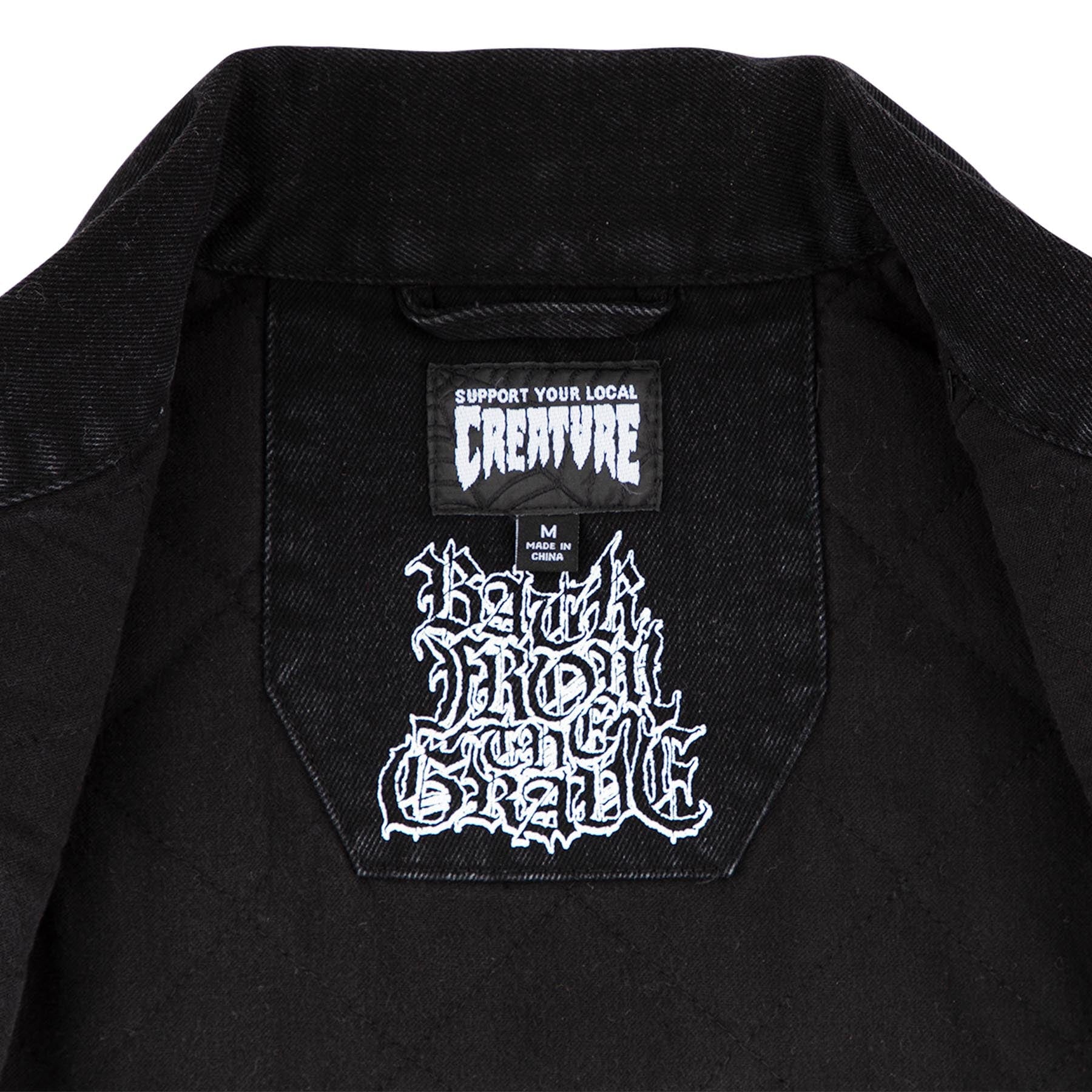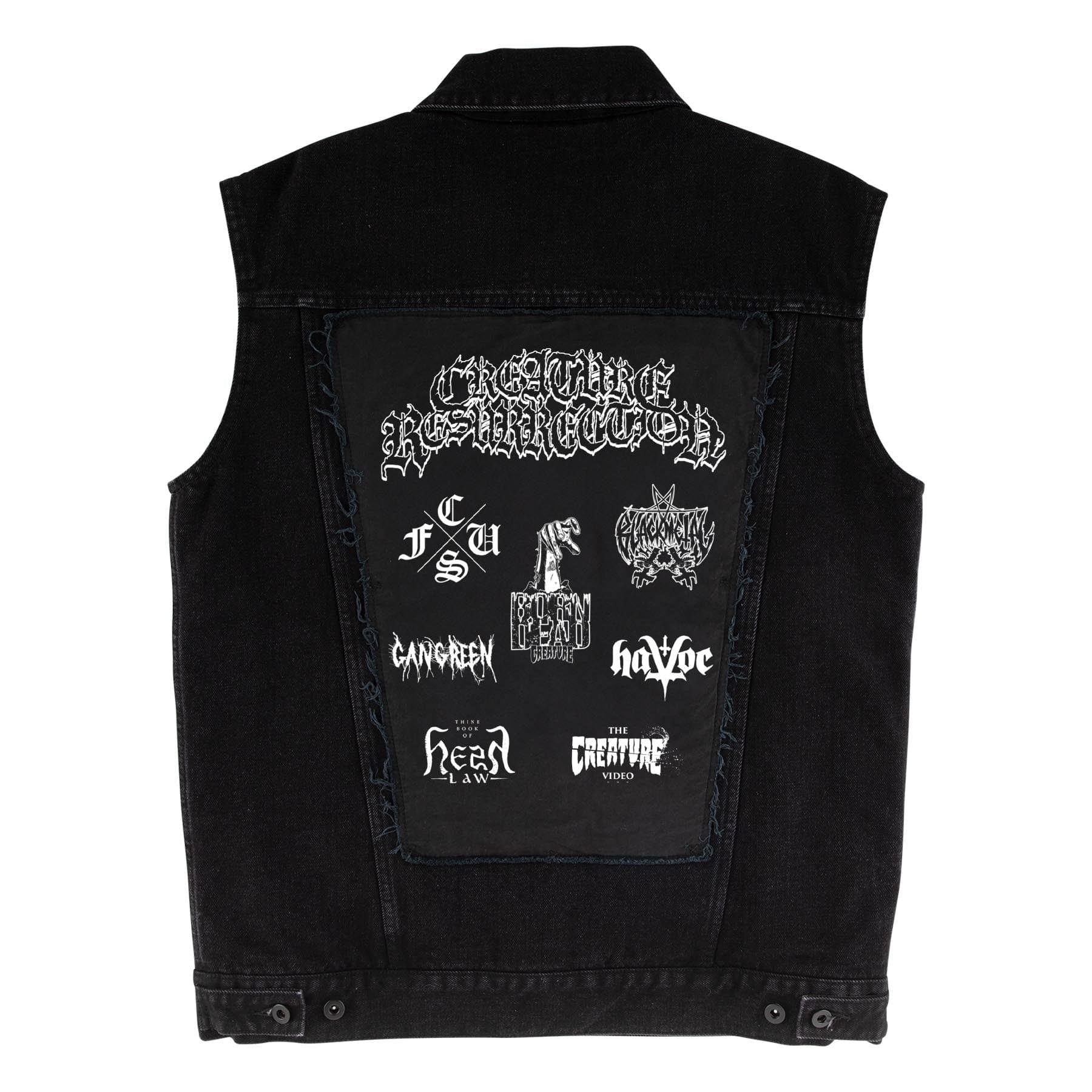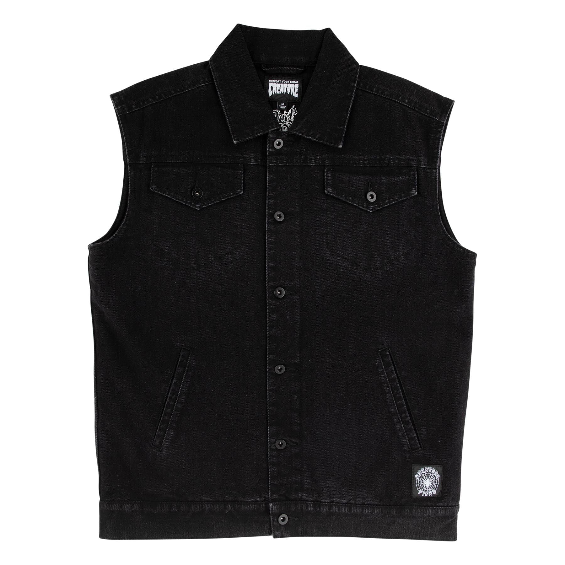 The Creature Resurrection men’s custom, regular fit denim vestfeatures quilted flannel lining, applied printed twill patch on back, welt hand pockets, interior elasticated patch pocket, custom woven label at hem and matte black hardware.